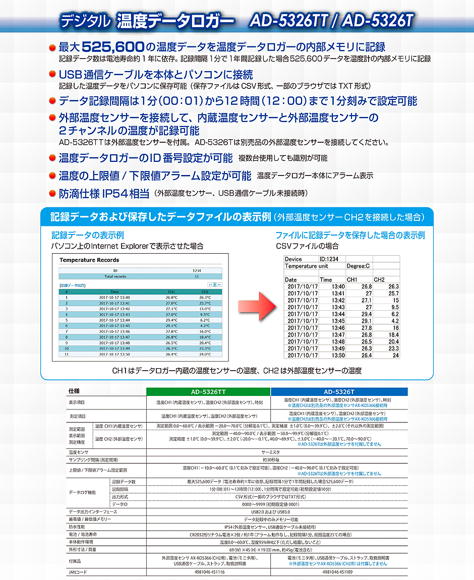 AND(A&D)數(shù)字溫度數(shù)據(jù)記錄AD-5326T